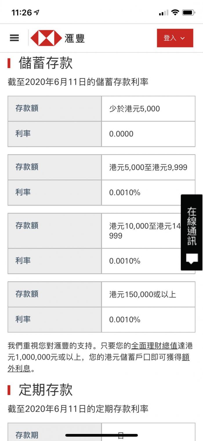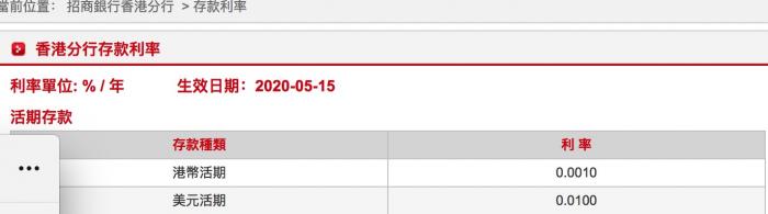 以下为汇丰和招商银行香港分行的最新活期存款利率截图