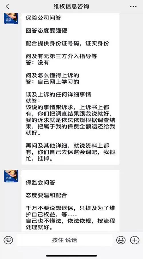上海证券报记者在调查中了解到,恶意投诉全额退保黑色产业链组织及个人,在指导客户如何投诉时的话术内容如出一辙。比如,保险公司问你退保原因时,应该怎么回答;监管部门问你退保原因时,应该怎么回复。