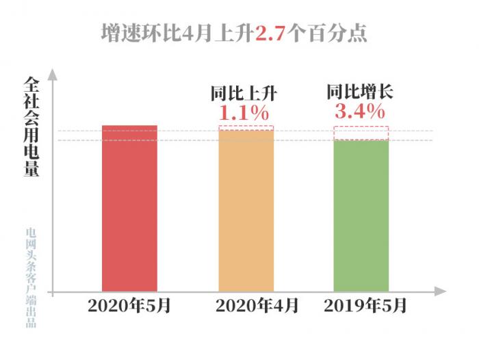 5月,国家电网公司经营区全社会用电量同比增长3.4%,增速环比4月上升2.7个百分点,同比上升1.1个百分点,今年以来首次超过去年同期水平。