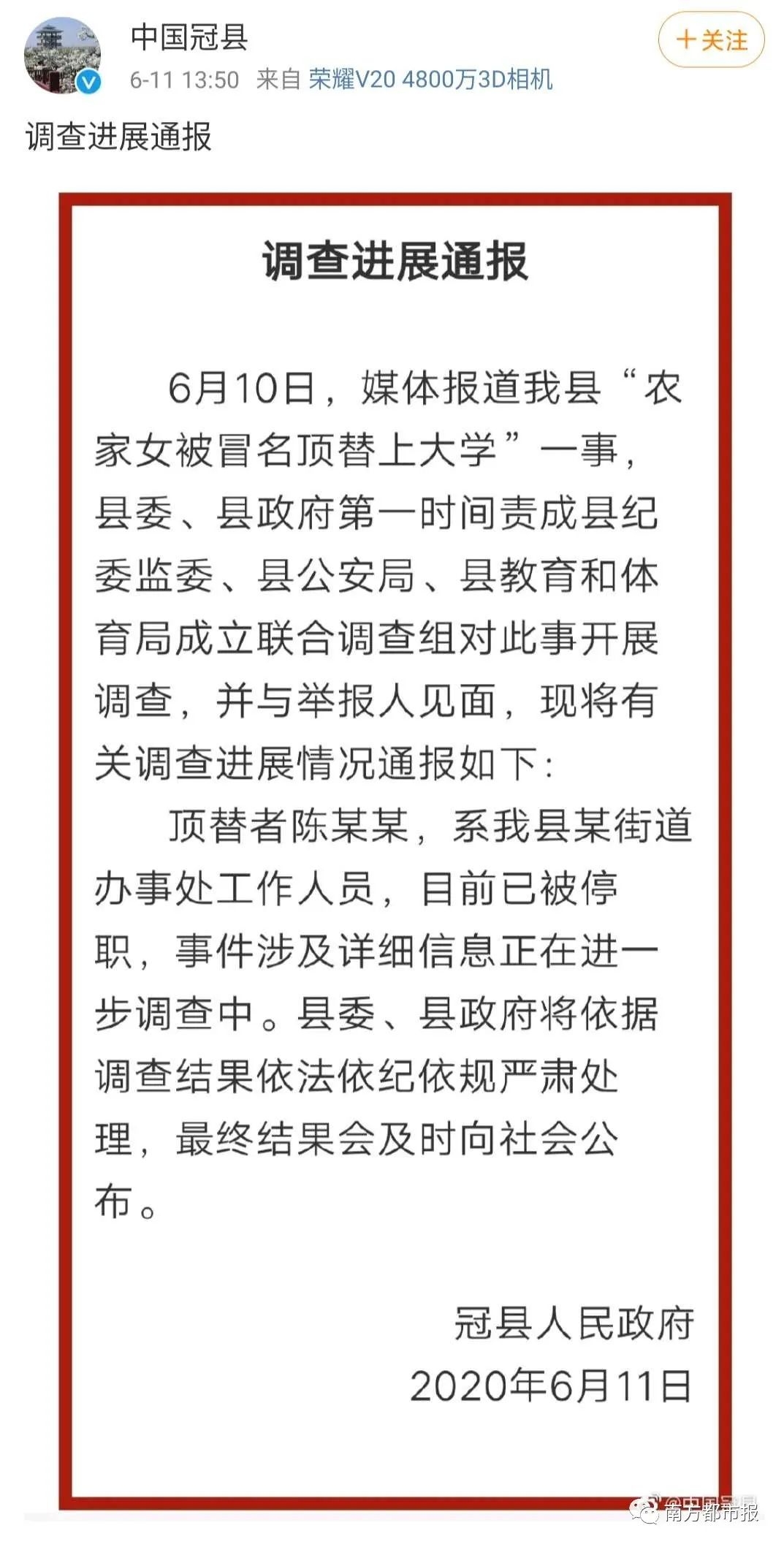 针对媒体报道的“农家女被冒名顶替上大学”一事,今天(11日)中午13时许,山东冠县人民政府最新通报称,顶替者陈某某,系该县某街道办事处工作人员,目前已被停职,事件涉及详细信息正在进一步调查中。县委、县政府将依据调查结果依法依纪依规严肃处理,最终结果会及时向社会公布。