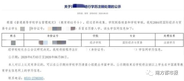 今天(11日),南都记者从山东理工大学教务处教学运行中心获悉,对陈某某进行学历注销处理的公示期已经结束,学校已经按程序注销陈某某学信网学历信息。一名工作人员表示,“调查结束了才公示并注销学历。学生个人承认是冒名顶替。”