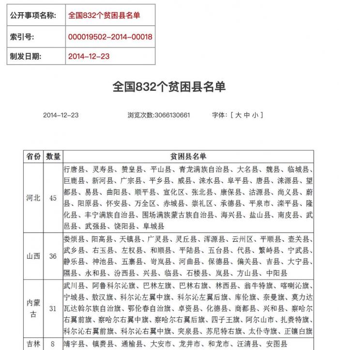 以下是国务院扶贫办2014年于官网发布的贫困县名单截图: