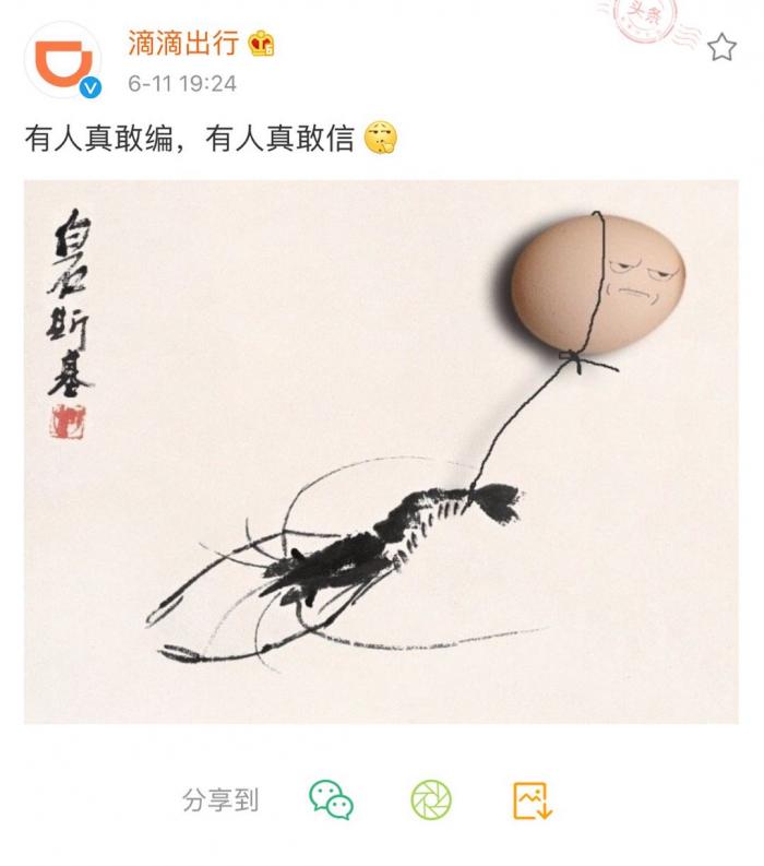6月11日晚间,围绕近日美团将并购滴滴的传言,滴滴出行官方微博在微博回应“有人真敢编,有人真敢信”,并配图“虾扯蛋”,否认了这一传言。