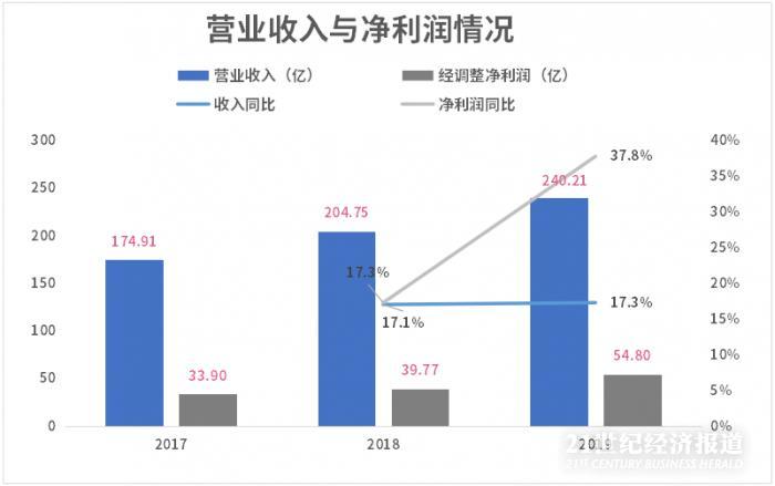 农夫山泉2019年营业收入为240.21亿元,同比增长17.3%,2018年的同比增速17.1%,增速较稳定,高于中国软饮料市场的年复合增长率5.9%。经调整后的净利润2019年录得54.8亿元,同比增长37.8%,净利润持续增长,且增速在2019年远超营收增速。