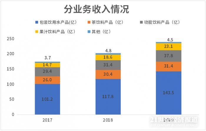 其中包装饮用水是最主要的业务,也是最原始的业务,主要是“农夫山泉”矿泉水和天然水。2017-2019年这块业务录得收入分别为101.2亿元,117.8亿元和143.46亿元,占到总营收的57.9%,57.5%和59.7%,占营收比重接近六成。