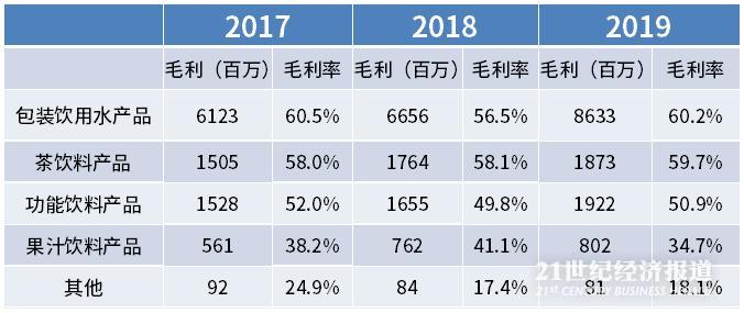 2017-2019年,公司的综合毛利率分别为56.1%,53.3%和55.4%,稳定在55%左右。包装饮用水、茶饮料和功能性饮料在2019年的毛利率分别达到60.2%,59.7%和50.9%。