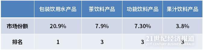 公司的茶饮料有东方树叶和茶π两个品牌,功能饮料主要是“尖叫”,果汁饮料包含水溶C100,农夫果园,NFC等品牌,咖啡类品牌炭仌,植物蛋白类主要是植物酸奶。