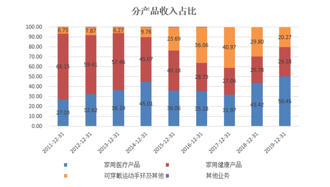 2016年上市的乐心医疗(300562.SZ),一直被认为是医疗器械类的上市公司。的确,在公司上市之前,收入的80%以上来自于医疗健康类的产品,上市之后虽然有过短暂的一段时间可穿戴业务占比的提升,但2018年之后占比又再次下滑,直至2019年,在收入的占比中,医疗健康类产品又重回80%。