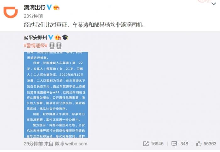 不久后,滴滴网约车总裁陈熙也转发微博表示:“郑州警方好神速... 这对小夫妻欠我们的司机师傅们几百万个道歉了。”