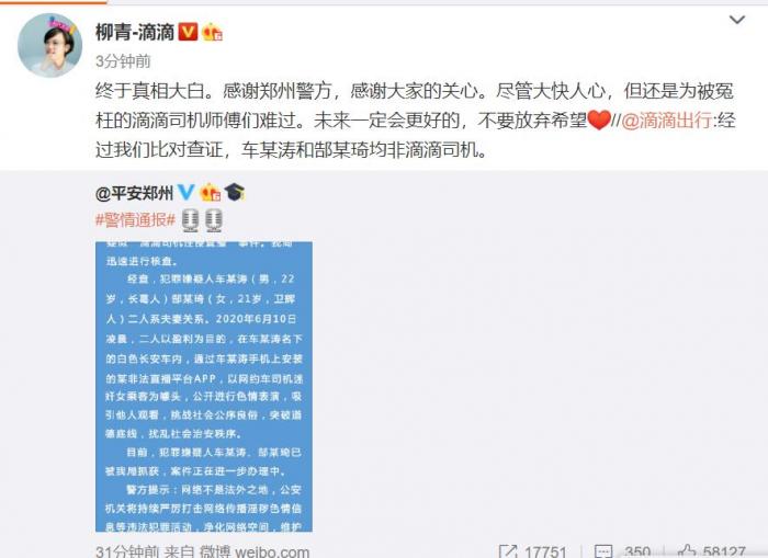 滴滴出行总裁柳青转发了微博并表示,终于真相大白。感谢郑州警方,感谢大家的关心。尽管大快人心,但还是为被冤枉的滴滴司机师傅们难过。未来一定会更好的,不要放弃希望。