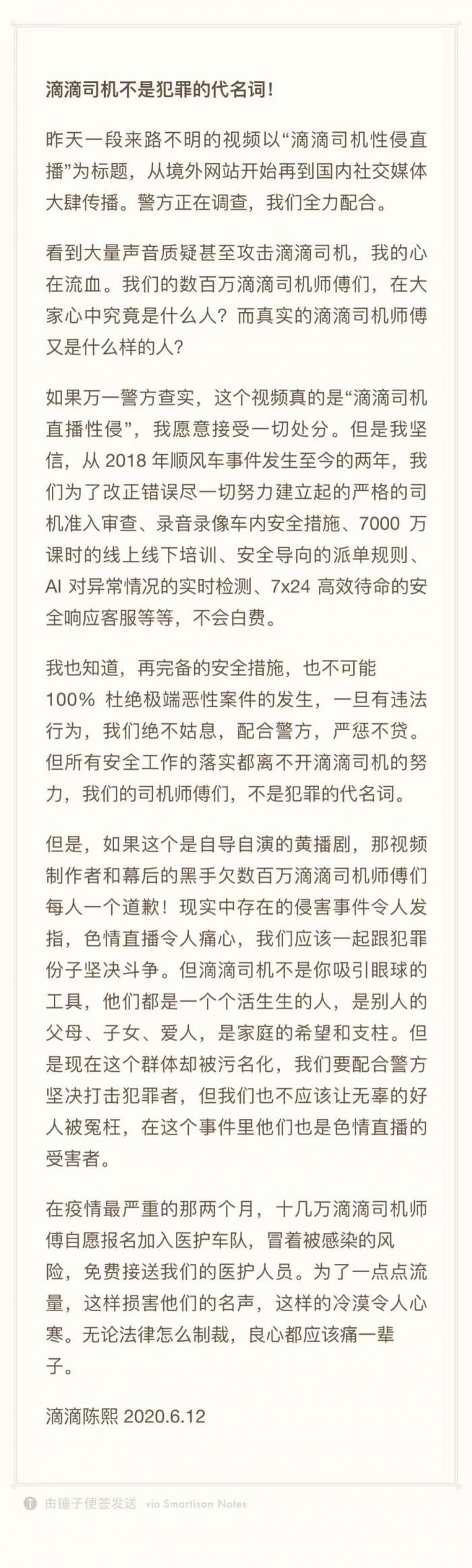6月12日下午16点许,滴滴网约车总裁陈熙发微博称,“滴滴司机不是犯罪的代名词。昨天一段来路不明的视频以“滴滴司机性侵直播”为标题,从境外网站开始再到国内社交媒体大肆传播。警方正在调查,我们全力配合。如果万一警方查实,这个视频真的是‘’滴滴司机直播性侵‘’,我愿意接受一切处分。但是,如果这个是自导自演的黄播剧,那视频制作者和幕后的黑手欠数百万滴滴司机师傅们每人一个道歉”。