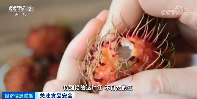 杭州市公安局余杭区分局治安行动大队副大队长 马浩然:第一是特别艳的红,不自然的红;第二是它浸泡了之后,上面水分比较多;第三是它闻起来有刺鼻味道。红毛丹买回去了之后,如果能够放两天以上的,那很有可能就是有问题。