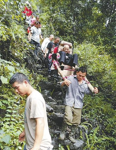 下南乡下塘村,山外建好了易地扶贫搬迁的新居后,当地干部群众将91岁的谭运日老人抬出大山。