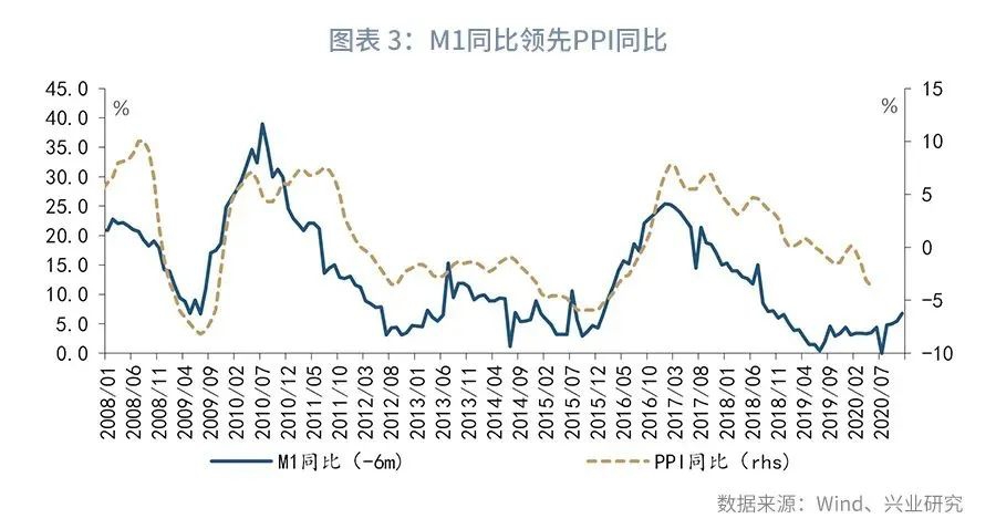 M1同比的回升可能带来哪些变化呢?一方面,M1同比是微观主体活跃程度的重要标尺,M1同比的回升往往意味着企业生产经营活动更为活跃。因此,M1同比对PPI同比有一定的领先性。M1同比的持续回升表明,工业品价格有望逐渐回暖。