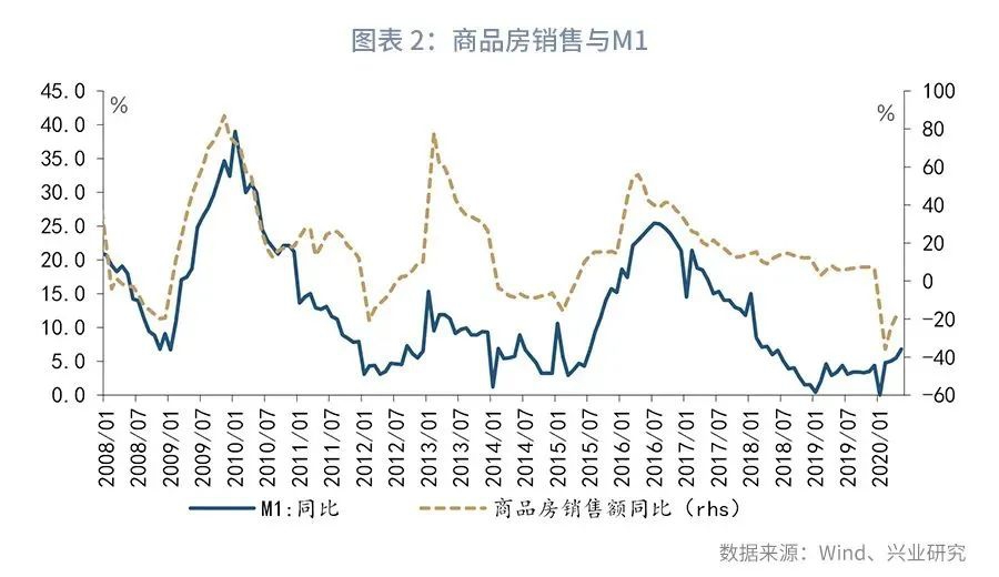 5月M1同比为6.8%,创下2018年5月以来的最高水平。2020年1月以来,M1同比增速持续回升。这反映了两方面因素的影响:一方面,2020年以来社融增速稳步上升,企业融资环境改善,进而带动企业活期存款增长;另一方面,疫情高峰过去后,前期积压的购房需求开始释放,商品房销售降幅收窄,使居民存款向企业存款的转化加快。