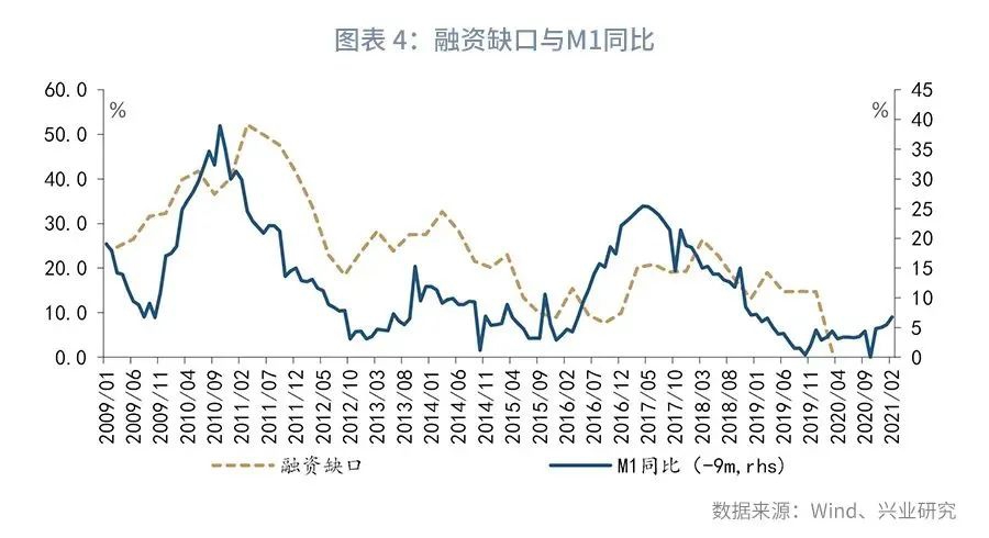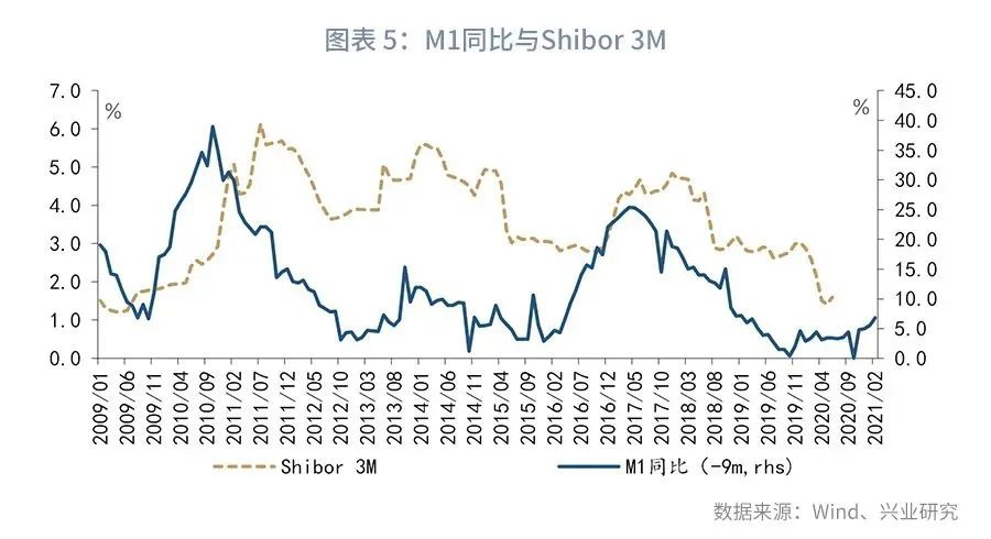 另一方面,经济活跃度提高将使企业融资需求上升。数据显示,M1同比对融资缺口和以Shibor 3M为代表的资金利率有一定的领先性。因此,M1同比的回升或预示着未来融资缺口有扩大的可能,进而给资金利率带来一定的上行风险。