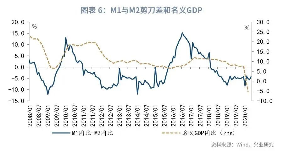 不过,虽然M1同比回升较快,M1与M2同比增速之差仍然在-4.3%左右的较低水平。从2008年以来的经验看,这或许意味着名义GDP增速回升的力度将较弱。