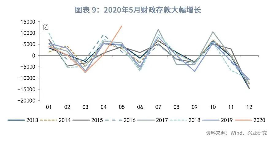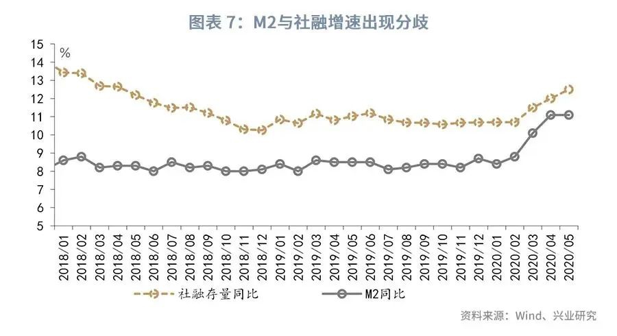 虽然5月社融增速上升至12.5%,但M2同比与上月持平于11.1%。这是由于政府债券是推动5月社融增长的主力,而地方政府债券发行集中于5月下旬,部分融入的资金未能在5月形成财政支出。随着地方债募集资金逐渐投入使用,M2同比将有“补涨”的动力。