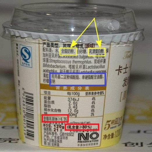 宋亮表示,非乳固体在不同产品里面代表不同的东西,低端酸奶里面指的一般是如淀粉、明胶、果胶之类的增稠剂,高端酸奶里用的则是乳清蛋白粉。