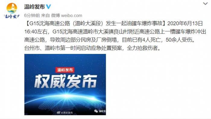 据温岭市政府新闻办公室官方微博:2020年6月13日16:40左右,G15沈海高速温岭市大溪镇良山村附近高速公路上一槽罐车爆炸冲出高速公路,导致周边部分民房及厂房倒塌,目前已有4人死亡,50余人受伤。台州市、温岭市第一时间启动应急处置预案,全力抢救伤者。