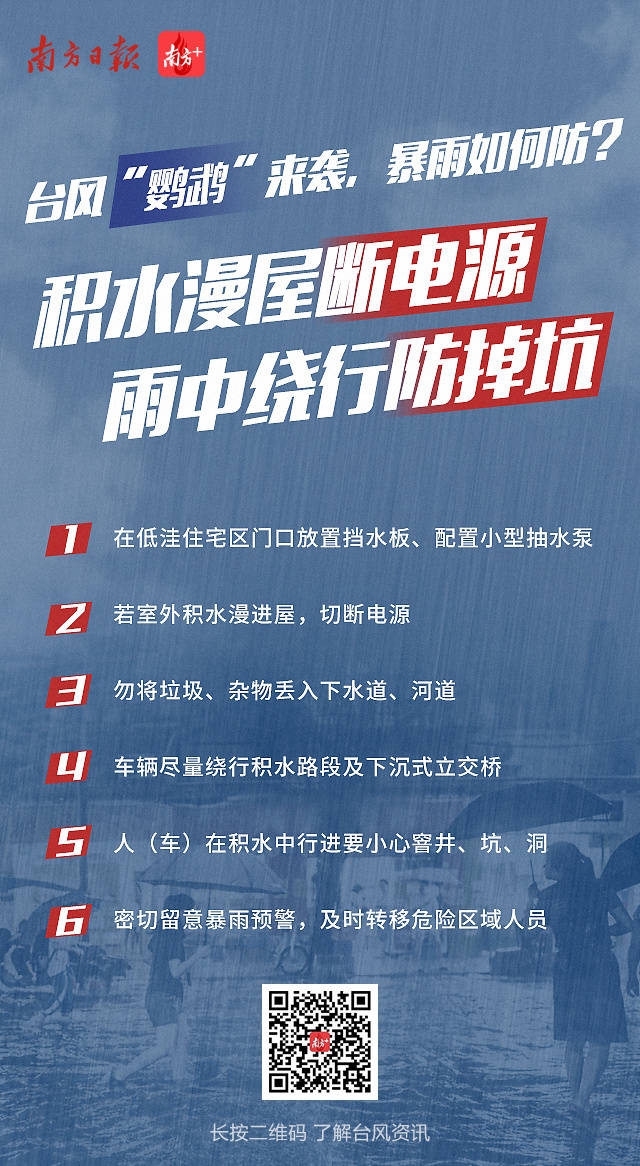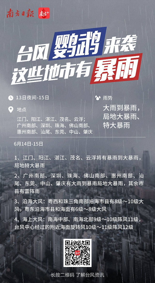 不要只关心台风中心和登陆点,首先广东都将有明显风雨天气;其次,台风“鹦鹉”云系较庞大,将给广东多地带来强风雨,特别是粤西。此外,前期广东受季风影响出现了大范围暴雨,地质灾害风险很高,这次雨区有可能叠加,再次出现强降水极易引发城乡积涝、山洪、泥石流、山体滑坡等灾害,需特别注意防御灾害的发生。