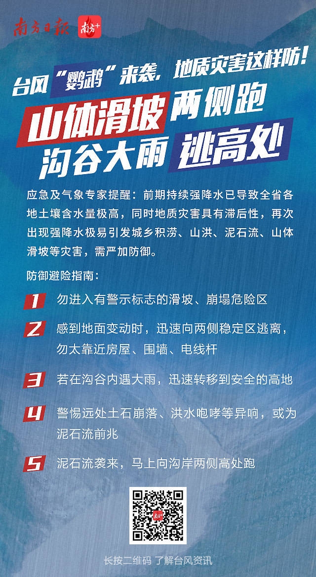 3、风雨直接影响小不等于安全。即便台风给内陆带来的直接风雨影响不大,但可能与前期汛情叠加,产生泥石流等次生灾害。