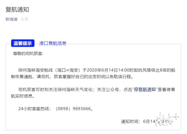 最新消息!琼州海峡海安航线(海口——海安)将于14日14时起复航,但对船舶有要求,抗风等级达到8级的船舶可恢复通航。