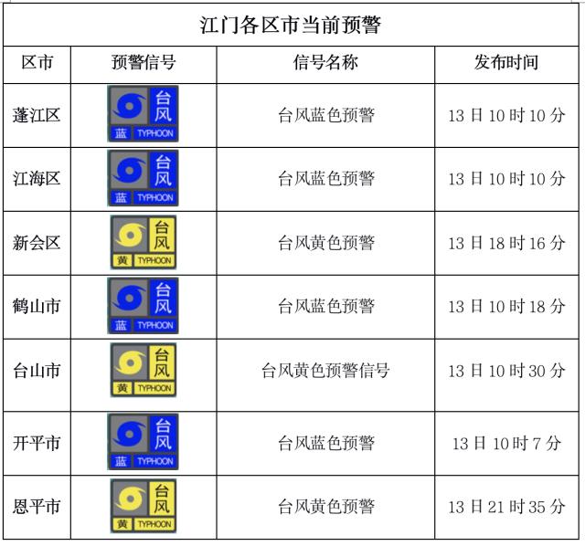 截至9时10分,全省仍有66个台风预警信号维持,其中阳春、恩平、新会、化州、高州、信宜、电白、茂名、斗门、珠海、台山、阳西、阳江发布13个台风黄色预警,同时阳西、廉江、遂溪、湛江、吴川、高州、茂名、信宜、电白发布暴雨黄色预警。