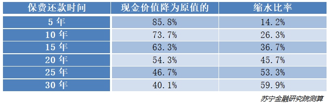 在此,以每年3%的CPI增长率计算,经过一定时间后,退还保费的现金价值缩水情况如下: