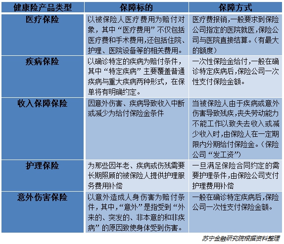 在此需要说明,我们常见的健康险其实仅包括医疗保险、疾病保险、收入保障保险和护理保险四种产品类型。严格意义上,意外伤害险不属于健康险的范畴,但意外险与健康险互为补充,为我们的家庭提供全方位的保护,故在此一并讨论。