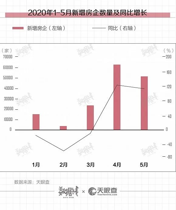 今年以来,新增房企数量累计达到约15.75万家,累计同比增长46.3%。其中,4月单月,新增房企约6.3万家,同比增长122.84%。
