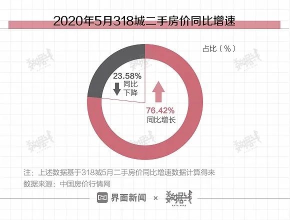 在房价方面,据中国房价行情网数据,2020年5月,在其监测的318城中,包含北上广深4个一线城市在内的近8成城市,二手房平均单价均实现同比增长。