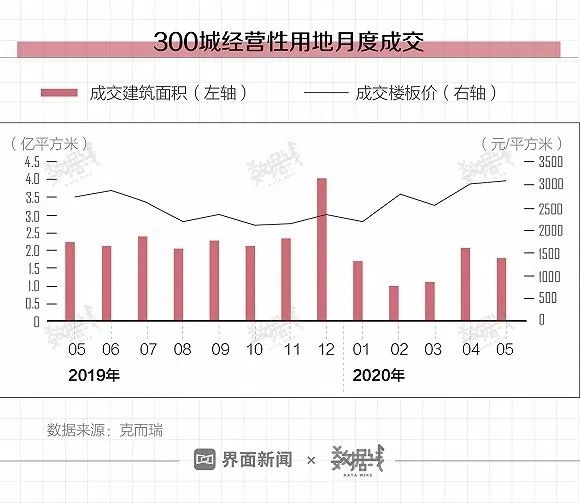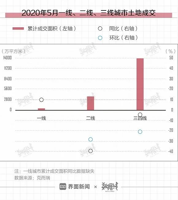 据克而瑞数据,截至5月28日,5月全国300城经营性土地成交建面总计1.7975亿平方米,同、环比分别下降21%和14%。