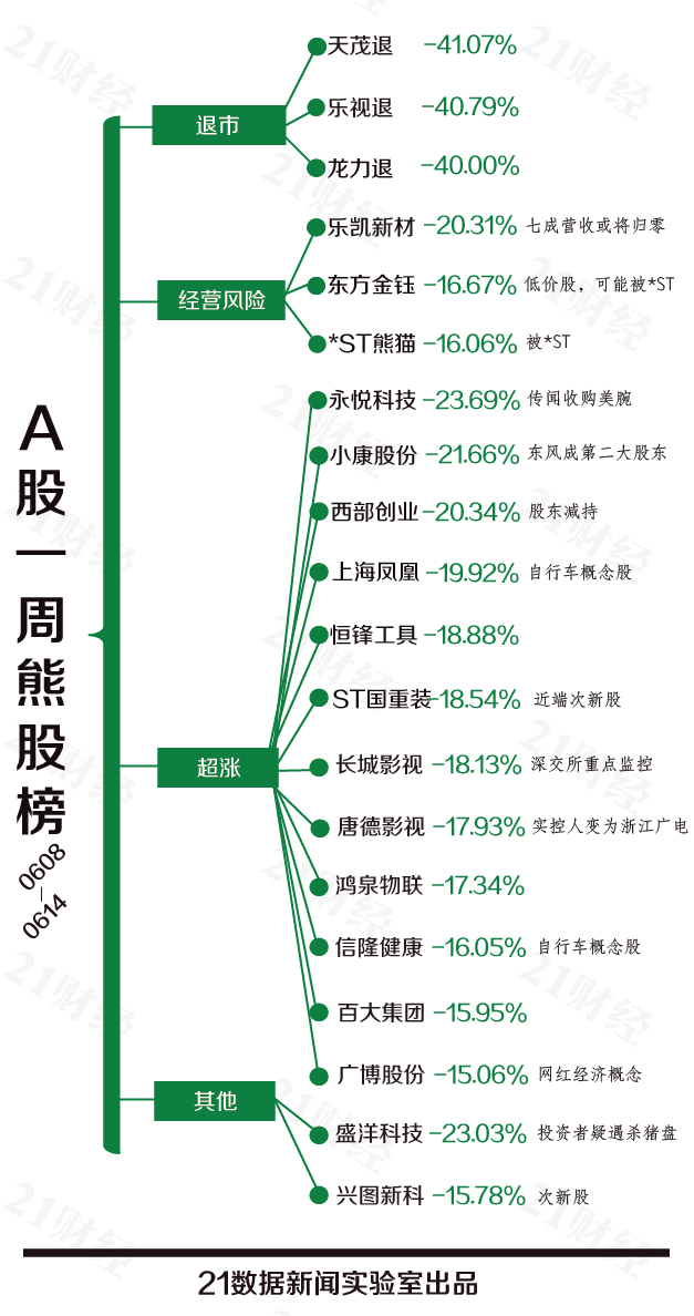 本期熊股TOP20中,东方金钰(600086.SH)、小康股份(601127.SH)、长城影视(002071.SZ)、唐德影视(300426.SZ)、鸿泉物联(688288.SH)等5股为上周牛股榜单个股,本周进入下跌通道,周跌幅都超过15%。