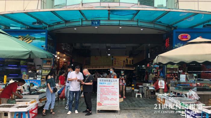 21世纪经济报道记者注意到,往常市场中部分摊贩有切割好的三文鱼售卖,但目前已全部下架。仅市场外部商铺中,一家专门销售三文鱼刺身的店铺仍在营业。同时,该市场内部分商家、消费者并未佩戴口罩。