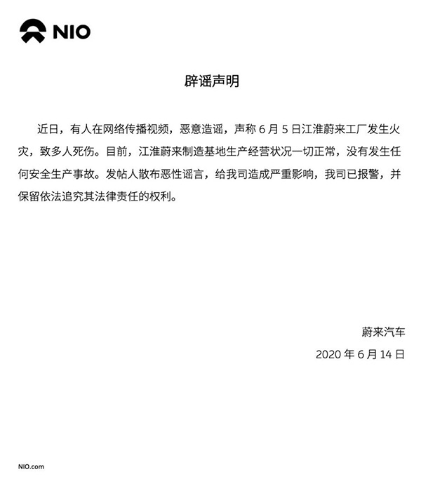 6月14日晚间,$蔚来(NIO.US)$汽车发布声明,否认江淮蔚来制造基地发生火灾。蔚来在声明里称,近日,有人在网络传播视频,恶意造谣,声称6月5日江淮蔚来工厂发生火灾,致多人死伤。目前,江淮蔚来制造基地生产经营状况一切正常,没有发生任何安全生产事故。发帖人散布恶性谣言,给我司造成严重影响,我司已报警,并保留依法追究其法律责任的权利。
