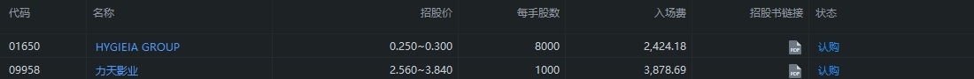今日可认购新股:$HYGIEIA GROUP(01650.HK)$、$力天影业(09958.HK)$