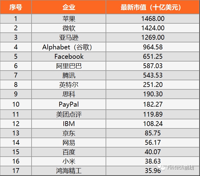 零壹财经·Fintech前线关注的20家中美BigTech企业: