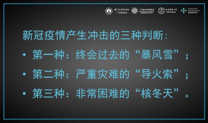 第一种判断:终会过去的“暴风雪”。人类社会、经济发展、企业基本都是健康的,但是遇上了新冠疫情,导致了经济困难。但疫情过后,经济又会复活,就如同一座城市遇上了一场暴风雪。今年二三月份,各国的经济专家和政要的判断主要是这一种。