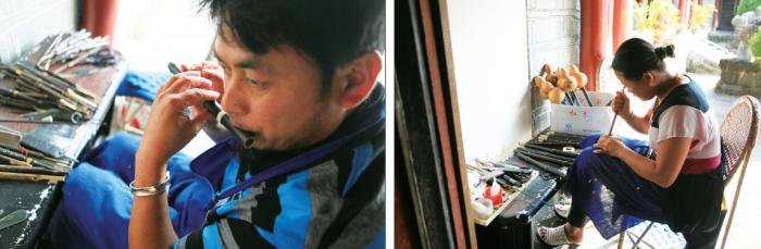我早早地来到旧土司衙门里,他和妻子一天的忙碌已经开始了。他个头中等,蓄着大胡子,腰绕围巾,在门前小长桌前校音。