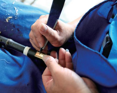 杜德光会先用一把刀子对簧片刮上一番,簧片变薄了,尖尖的头部翘了起来,变得灵活而敏感——这个过程让人深刻理解了什么叫做“巧舌如簧”。如果声音不满意,他还会再将簧舍再刮一刮或压一压。