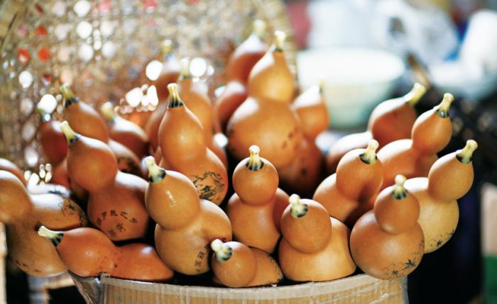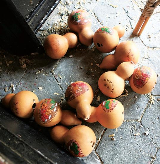 杜德光老家在梁河的傣族村子。葫芦瓜就是他自己种的。每年种上几藤,就够一年用,因为一藤就能长许多葫芦瓜。葫芦瓜成熟后,摘下来晒干,瓤掏掉,就能用来做葫芦丝了。