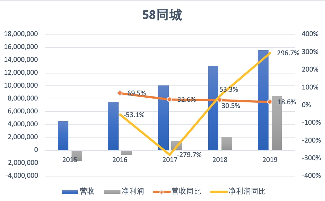 不过,高峰之后,58同城也开始遇到业绩增长的瓶颈期,2018年第三季度之后,季度营收增速连续6个季度不断下滑,同比增速从33.2%下降到15.1%。