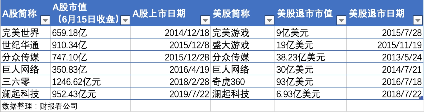 不过如果说要再次上市之后的溢价,A股可能并不逊于港股市场。财报看公司整理了6家近年来中概股回A股上市的公司发现,当前A股市值与美股退市相比,市值最少也翻1倍多,最多的高达十几倍。