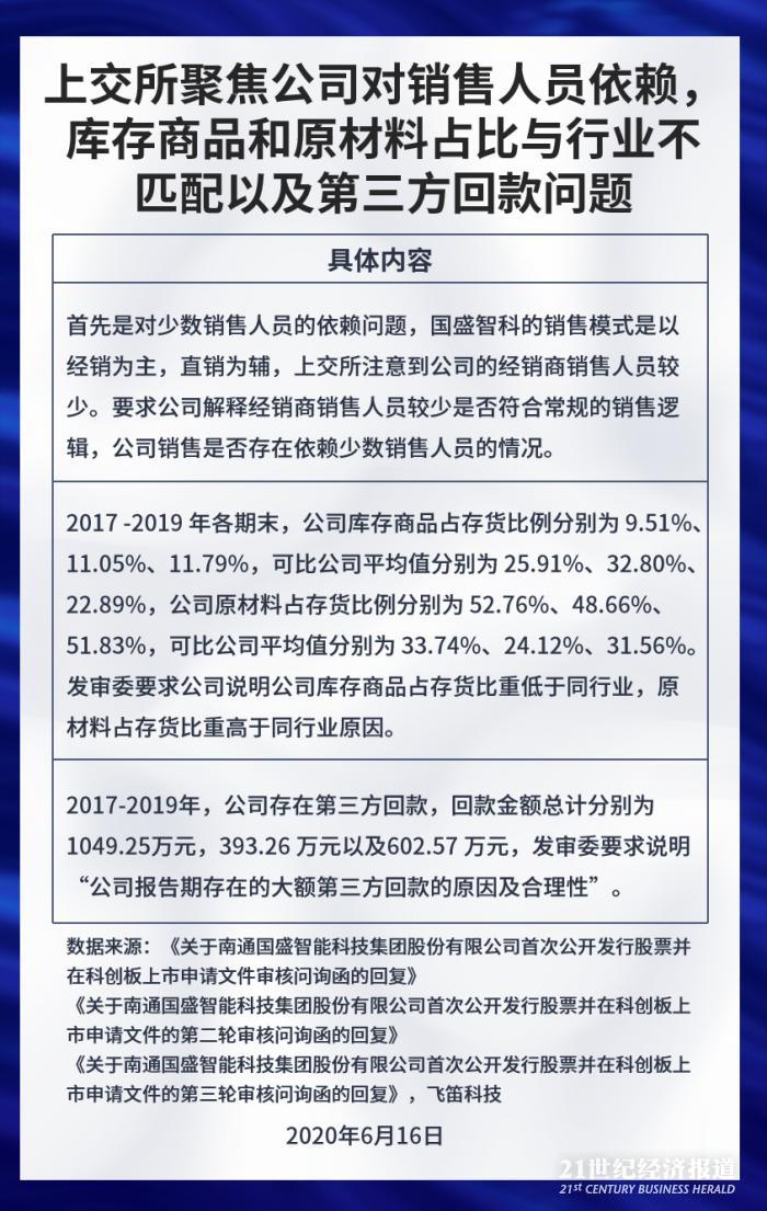 上交所关注的问题中,对少数销售人员的依赖,库存商品与原材料占比与行业不匹配以及第三方回款问题值得注意。
