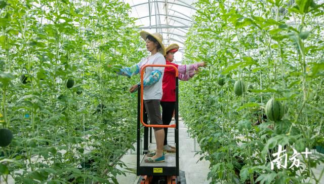 “在家门口的大棚里就能种上优质西瓜,收入不少,还能照顾家公和孩子,我很满意。”张顶娣一边修剪挂在半空的藤条,一边笑着说。