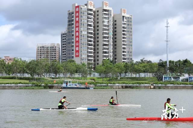 深圳宝安,清水碧波上,三四条皮划艇快速穿梭,两岸绿草茵茵花木繁盛。