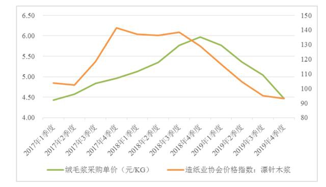 自2017年第三季度起,因为环保、贸易战等因素,绒毛浆价格出现巨幅上涨,至2018年末维持在历史高位水平,2018年6月较2017年1月涨幅超过30%。2018年末至2019年末绒毛浆价格开始下降,并在2019年末降至上涨前的水平。同时期,由于卫生纸的主要原材料为绒毛浆,前者价格变动趋势也遵循了类似曲线。