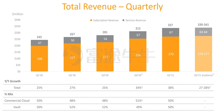 细看公司订阅业务收入的话,可以发现在2021Q1中,Veeva的订阅业务实现了36%的高速增长,其中商业云和开发云的占比相对均衡,分别实现35%和38%的高速增长。在此基础上,该公司预期2021财年全年将实现27%的订阅业务增长速度。