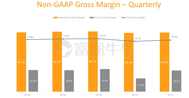 就其毛利率而言,2021Q1的公司总体毛利率高达74.2%,但是就细分业务而言,订阅业务的毛利率显著高于服务业务,分别为85%和30.5%,可以看出订阅业务的发展速度会对公司利润产生重要影响。